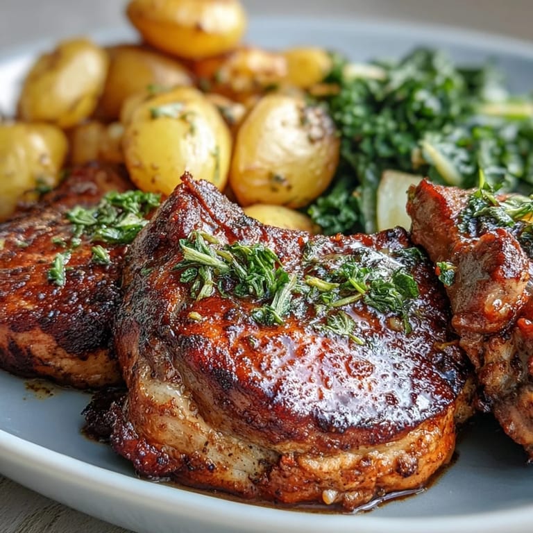 The bones in the pork chops are kind of the non-negotiable part because they really do keep everything juicier, but everything else is flexible in ways that might surprise you. The greens can be whatever's looking good at the market, the potatoes could become sweet potatoes if you're feeling experimental, and you could even do this on a grill if you prefer char over the oven's gentler approach. The marinade is where the soul of this dish lives, so keep that the same and let everything else be an conversation with what you have on hand.