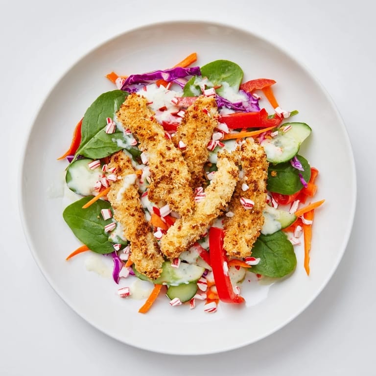 Save A festive and colorful wrap featuring crispy chicken, fresh vegetables, and a hint of peppermint crunch for a unique holiday twist.