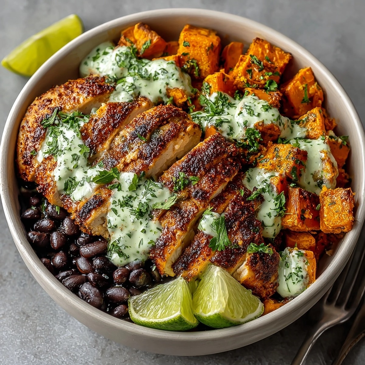 - In wide shallow bowls first layer the warm black beans then the roasted sweet potatoes and finally fan out slices of juicy chipotle chicken on top. Drizzle generously with the cilantro lime sauce finishing with a scatter of fresh cilantro and a squeeze from lime wedges.