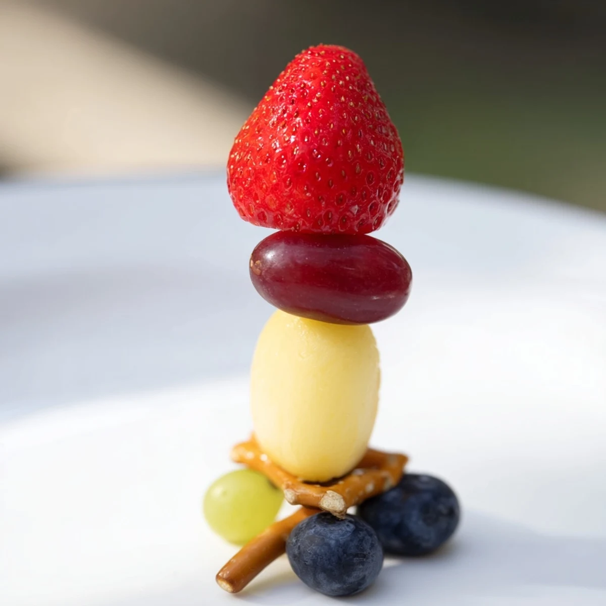 - 5. Next, slide one piece of fruit (grape, strawberry, pineapple, or blueberry) onto the stick, resting it against the marshmallow.