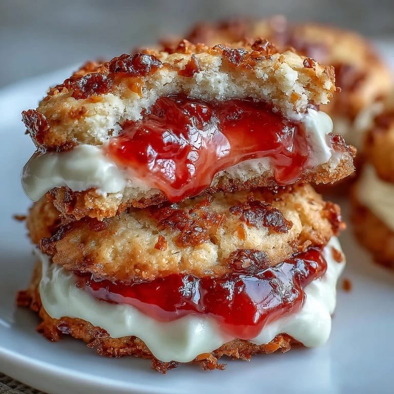 These tender cookies combine soft, buttery dough with creamy clotted cream and fruity strawberry jam. The thumbprint method creates a perfect hollow to hold the luscious fillings. Baking until lightly golden produces a delicate texture that melts in your mouth. Ideal for teatime, these treats offer a delightful balance of rich creaminess and sweet jam freshness.