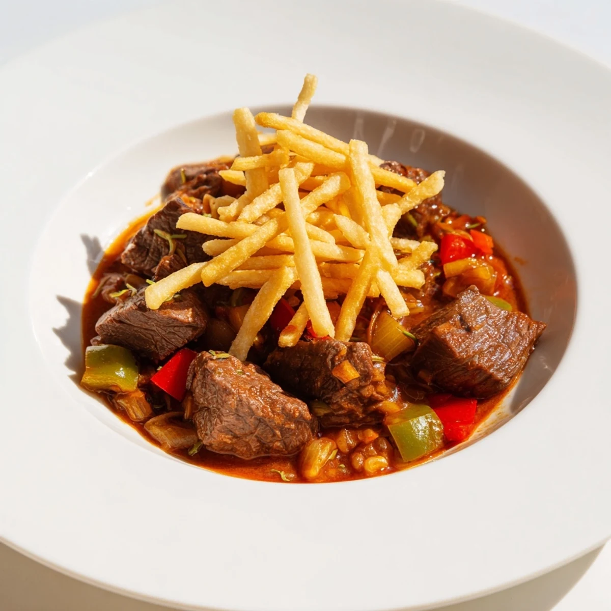 - Remove the bay leaf from the goulash, taste the sauce, and adjust seasoning because every pot is slightly different. Serve steaming bowls of goulash topped with a handful of crispy potato strips—the contrast is the whole point.