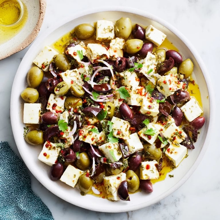 Save A vibrant and festive appetizer featuring a medley of marinated olives and creamy feta cubes, perfect for entertaining and holiday gatherings.