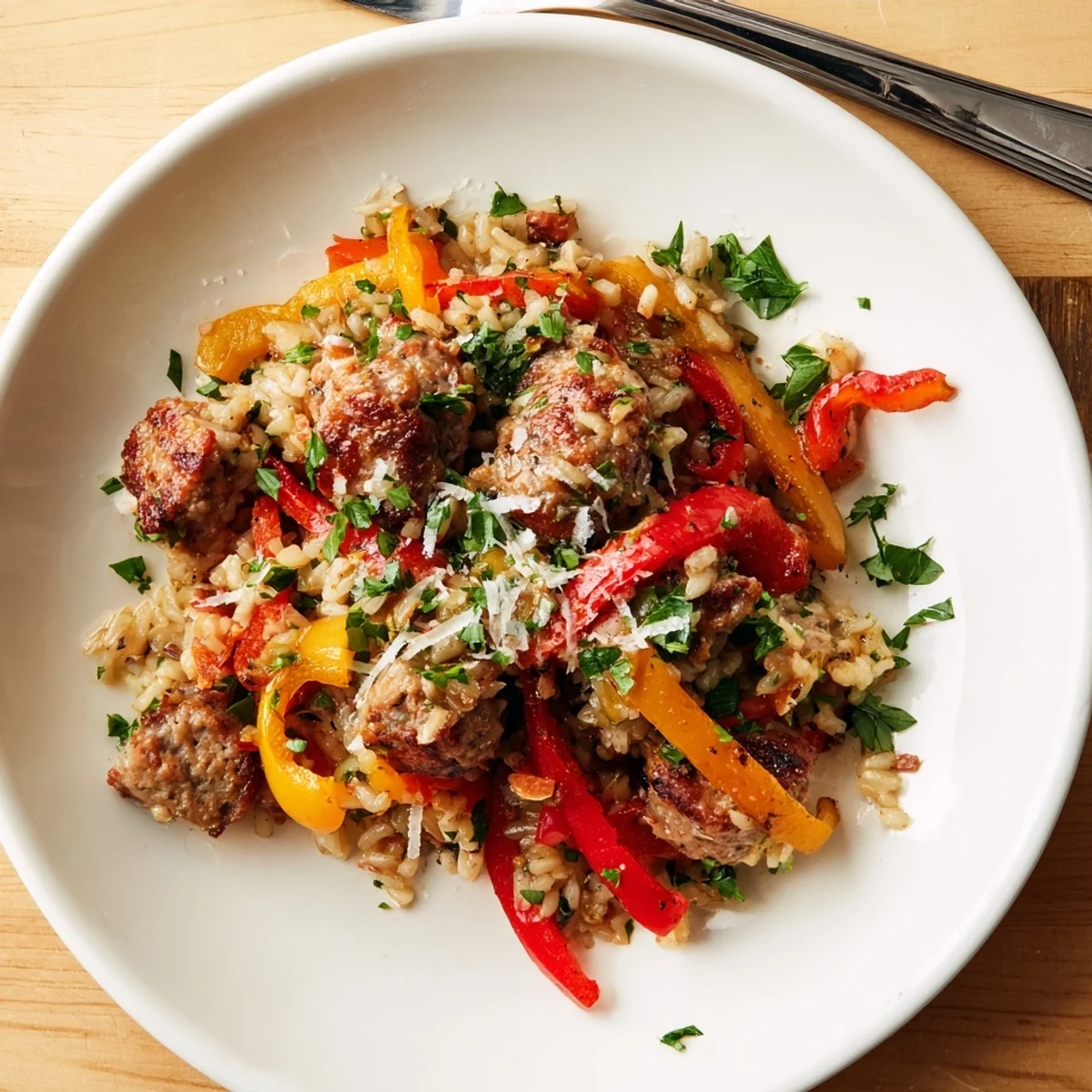 Save A hearty and flavorful dish featuring juicy Italian sausage, sautéed bell peppers, onions, and aromatic rice—perfect for a comforting weeknight meal.