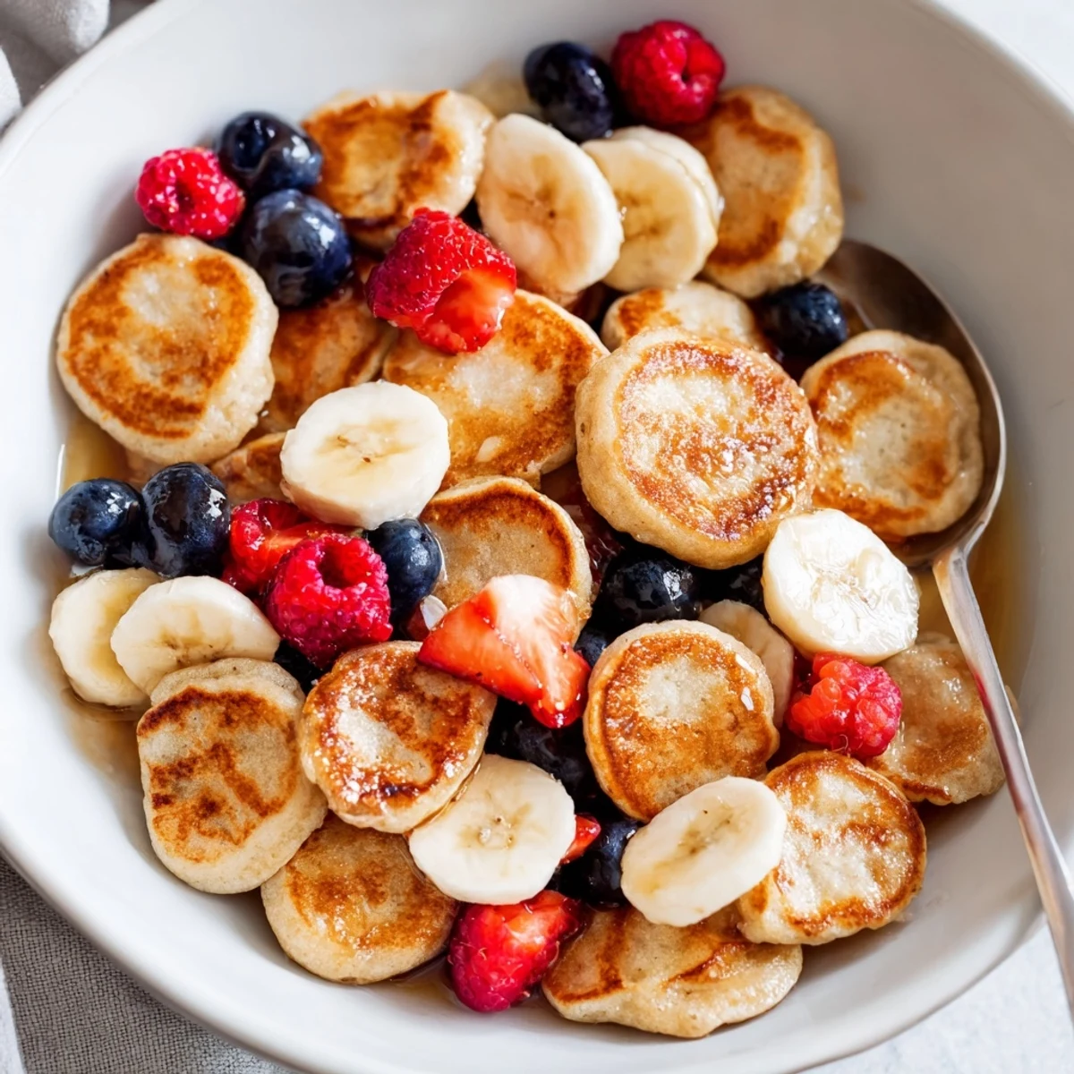 Save Adorable, bite-sized pancakes served like breakfast cereal—crispy on the outside, fluffy inside, and perfect with milk, syrup, or fruit.