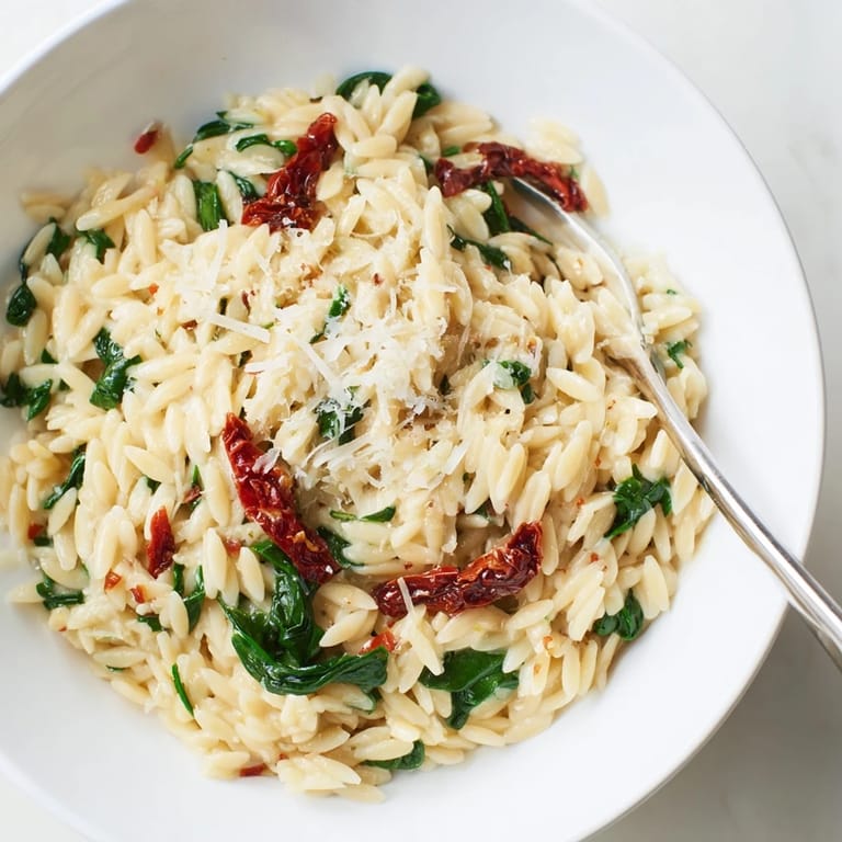 Save A rich and comforting bowl of orzo pasta, simmered in a creamy garlic-Parmesan sauce with sun-dried tomatoes, spinach, and a hint of Italian herbs. Perfect for a satisfying vegetarian meal.
