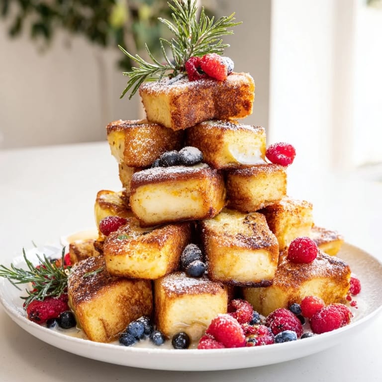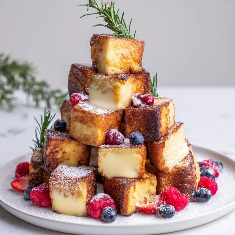 Save Festive, bite-sized French toast cubes infused with creamy eggnog, stacked into a charming tree shapeβperfect for holiday brunch gatherings.