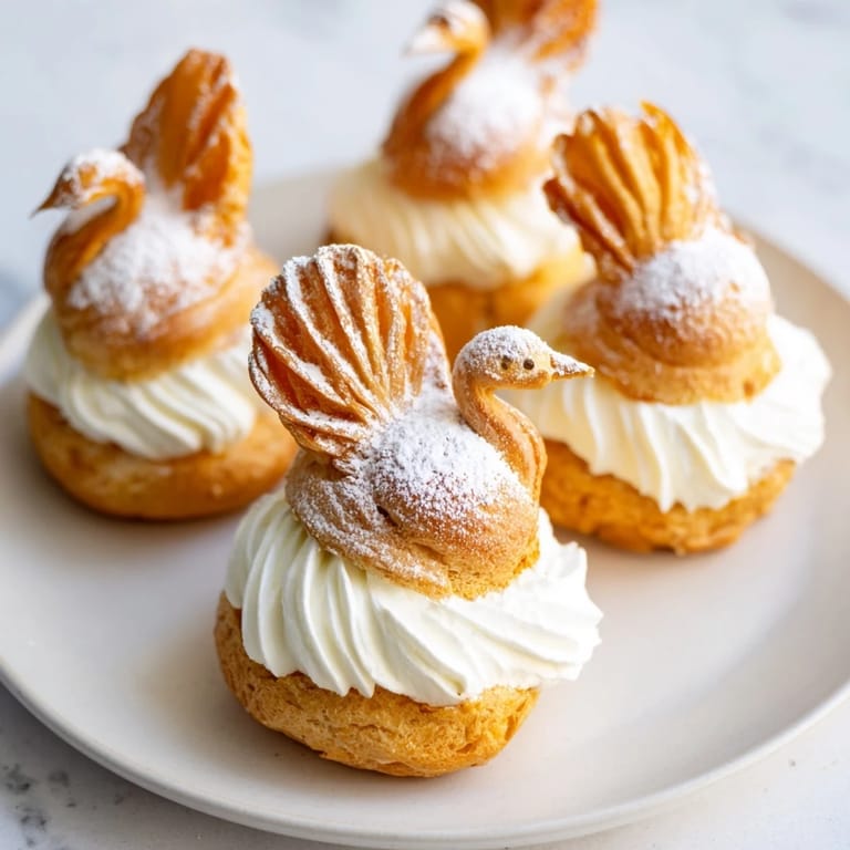 Save Charming, light choux pastry swans filled with vanilla cream and dusted with powdered sugar—perfect for an elegant dessert or tea-time treat.
