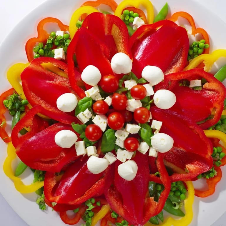 - 3. Arrange the red bell pepper strips in a circular, flower-petal pattern on a large round platter.