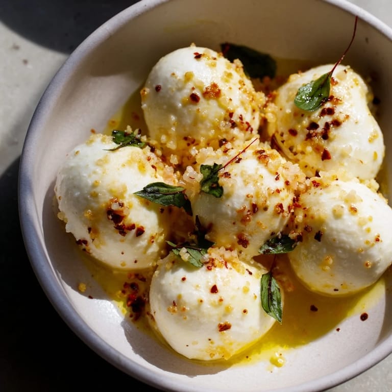 Save A fresh and delightful appetizer or snack featuring creamy mozzarella pearls lightly seasoned and served in a small bowl.