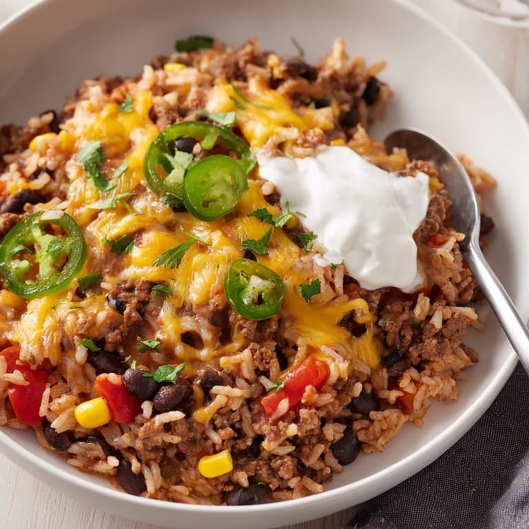 Save Experience the comforting warmth of a classic Tex-Mex Beef & Rice Casserole, where seasoned ground beef melds perfectly with tender rice, hearty black beans, and bubbling cheddar cheese. This casserole is bursting with zesty tomato flavors and aromatic spices, making it the perfect dish to gather around the table with family and friends. Easy to prepare and packed with hearty ingredients, it satisfies cravings and delivers a wholesome meal all in one.