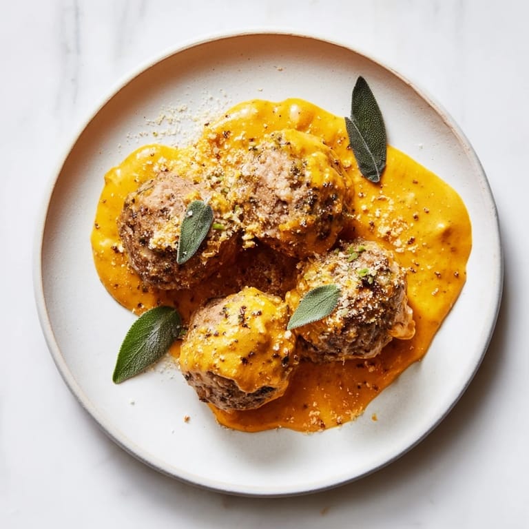 Save Juicy turkey meatballs are simmered in a creamy, aromatic pumpkin sage sauce, capturing the essence of fall. Serve over pasta, mashed potatoes, or polenta for the ultimate comfort meal.