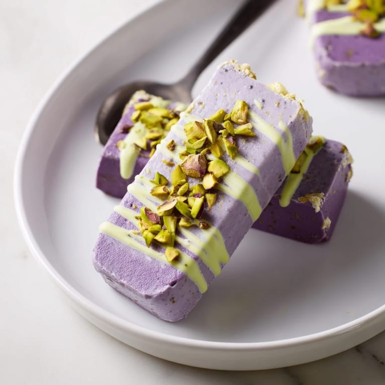 Save Creamy, vibrant ice cream bars featuring sweet ube and nutty pistachio, layered for a delightful contrast in flavor and color. Perfect for a refreshing summer dessert or an impressive treat for gatherings.